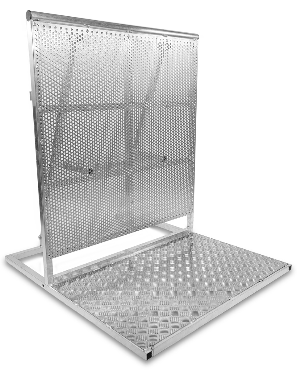 Pódiové zábrany a nášlapné bariéry slouží k bezpečnému oddělení diváků od účinkujících, nebo k vymezení prostoru pro účinkující, techniku či vymezení vstupního koridoru. Jsou vyrobené z oceli se sklopným systémem pro snadnější převoz. Konstrukčně jsou řešené tak, aby diváci svoji vlastní vahou zatížili tyto bariéry a nebylo možné s nimi pohnout. Fixují se dvoubodově k sobě navzájem a ze strany pořadatele či ostrahy je stupínek pro případný lepší přehled, nebo bezpečnostní zákrok.